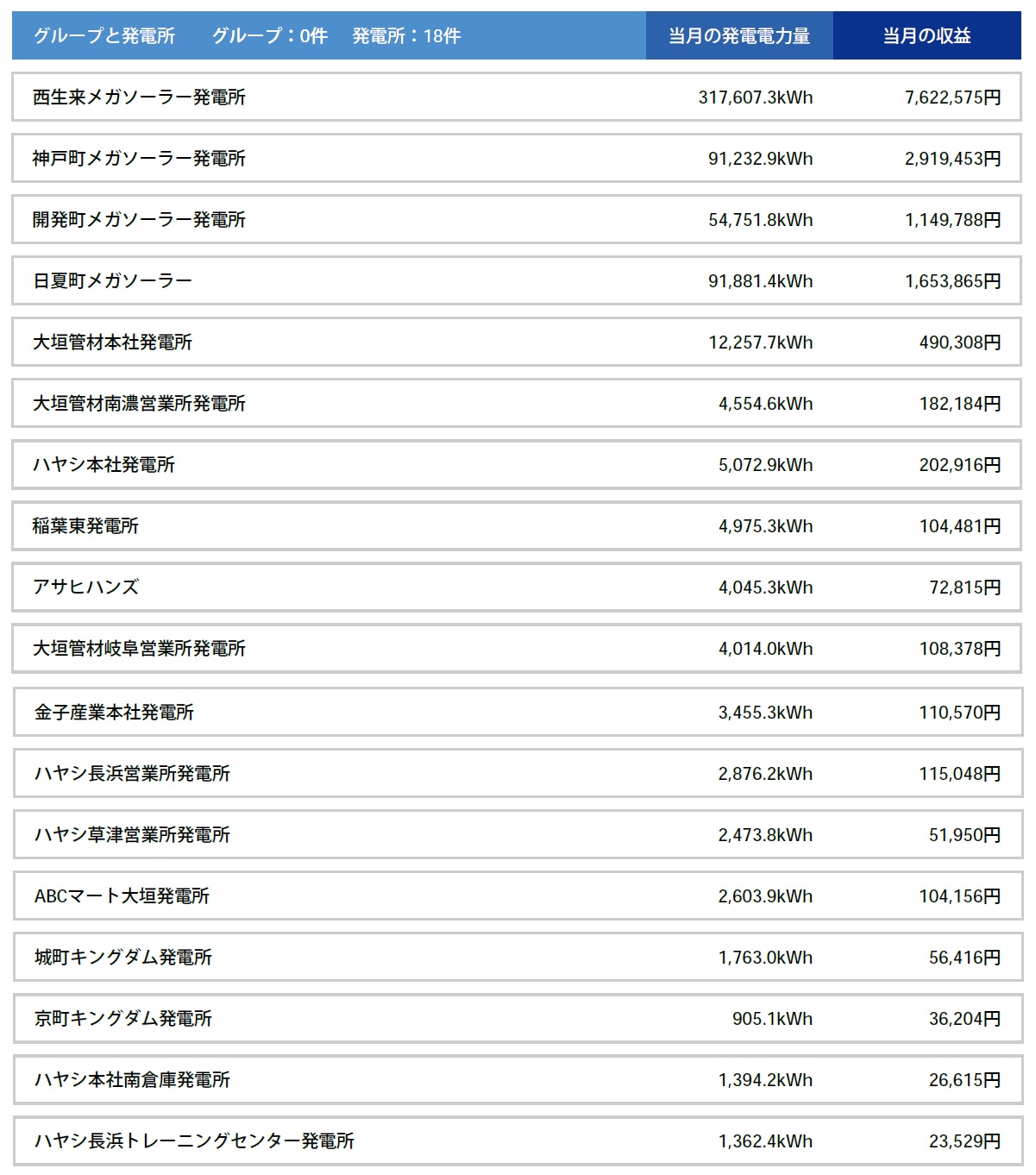 太陽光発電所(当社直営)の遠隔監視システムで18ヶ所の発電所の速報が出ました。