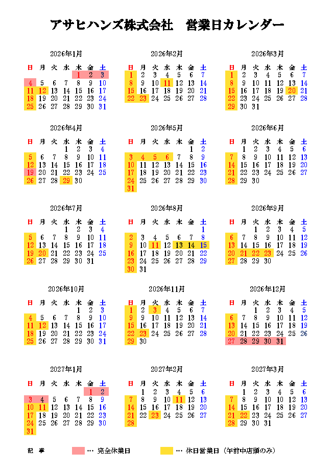 当社の2026年営業カレンダーになります。