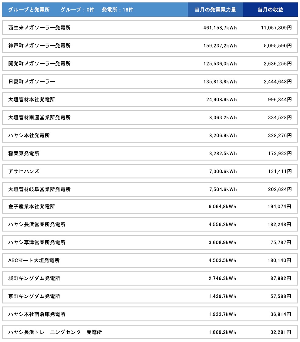 太陽光発電所(当社直営)の遠隔監視システムで18ヶ所の発電所の速報が出ました。